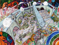 Christopher Reiger's scientific fairly tale comes from his childhood. As he grow up in the rural Delmarva Peninsula, his experience of hunting, fishing, or simply playing took him to many adventures, gaining curiosity to the nature and its ecosystem. Three paintings in the exhibition are the outgrowth of his fascination with the natural science and his long-tem habit of scribbling in the margins. Using mixed medium such as watercolor, sumi ink, acrylic and graphite, his painting creates a chaotic vision with the contrary image of nature and artificiality.