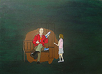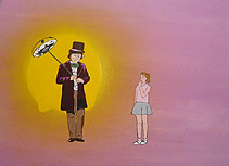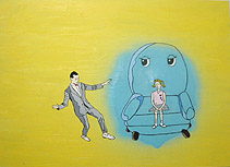 My work deals with children and their knowledge and participation in the not so hidden world of sex. We try to keep the idea of sex away from children while icons with sexual undertones stare us in the face everyday. Characters such as Pee-Wee Herman and Willy Wonka, which are geared towards children, appear innocent but are undeniably perverse. My paintings combine an "All-American" girl with one of these icons in a surreal setting in order to convey the uncomfortable feeling understood by the younger audience.