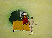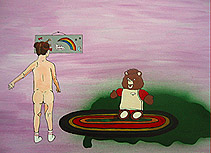 Not only do we try to hide sex from children but also we think they do not feel as sexual beings. The only things children can control are their toys and they use them in exploration. Barbie gets stripped down and put in bed with Ken and sometimes Skipper. Or children use other toys, performing sexual acts between them. My other paintings place a naked child in the presence of a toy, creating a feeling of uneasiness. It is unclear whether or not the toy is in control of the child or vice versa. Either way it is clear that the children understand what sex is about but are unsure how to approach the issue.